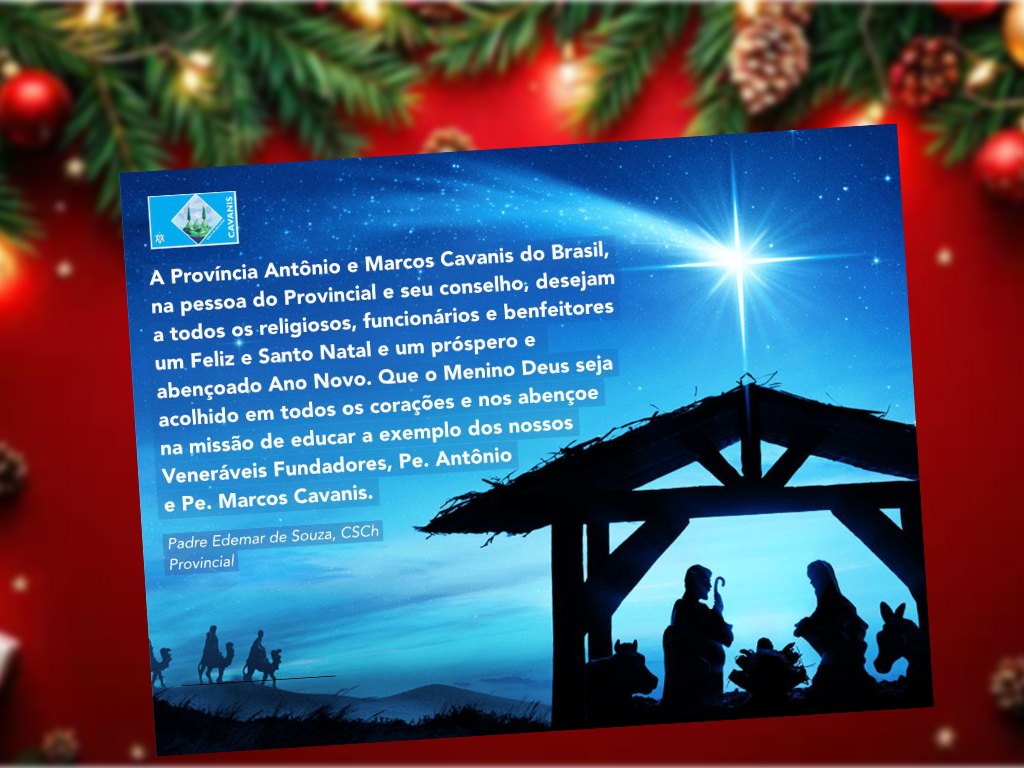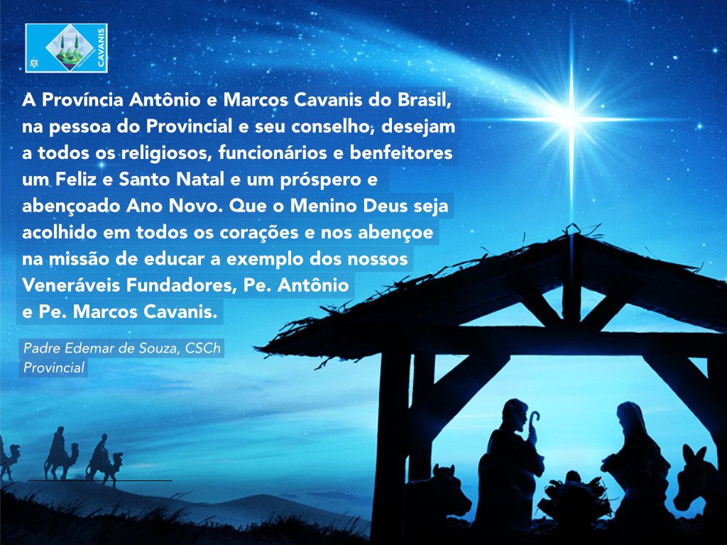 A Província Antônio e Marcos Cavanis do Brasil, na pessoa do Provincial e seu conselho, desejam a todos os religiosos, funcionários e benfeitores um Feliz e Santo Natal e um próspero e abençoado Ano Novo. Que o Menino Deus seja acolhido em todos os corações e nos abençoe na missão de educar a exemplo dos nossos Veneráveis Fundadores, Padre Antônio e Padre Marcos Cavanis.