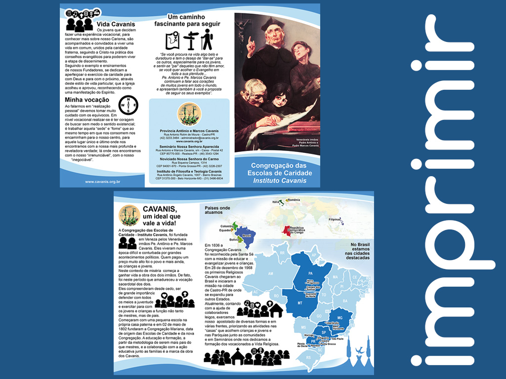 Folder Vocacional Cavanis Link do arquivo para impressão, abaixo...O arquivo em anexo possui um breve resumo sobre a história, carisma e missão de nossa Congregação. Pode ser impresso em impressora convencional e/ou gráfica e utilizado em diversas ocasiões, como encontros vocacionais, escolas, encontros juvenis, etc.