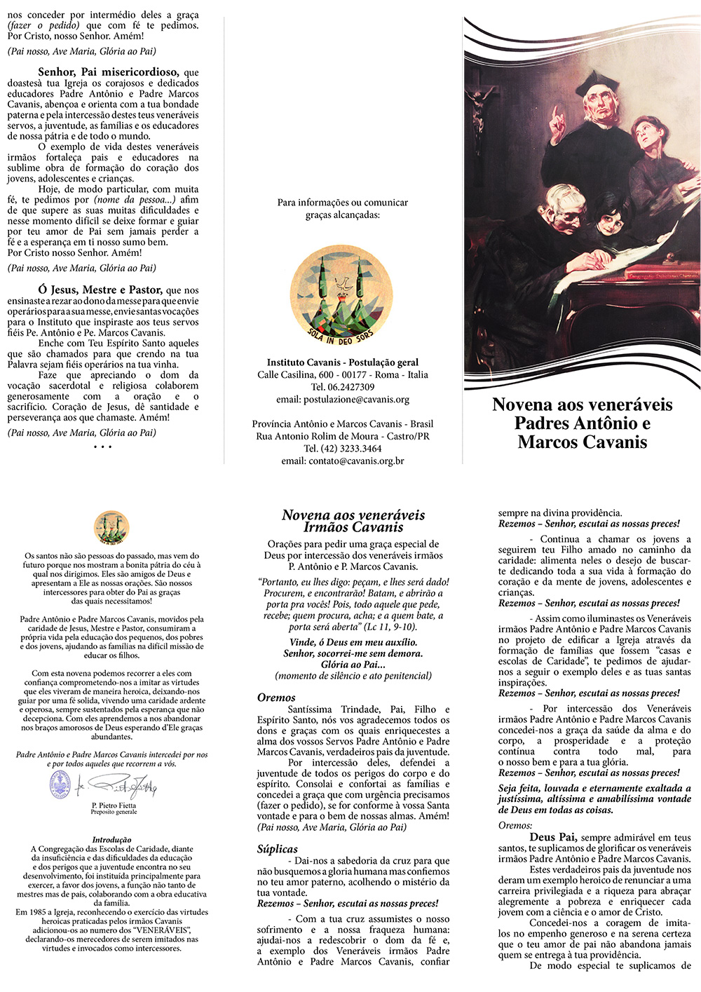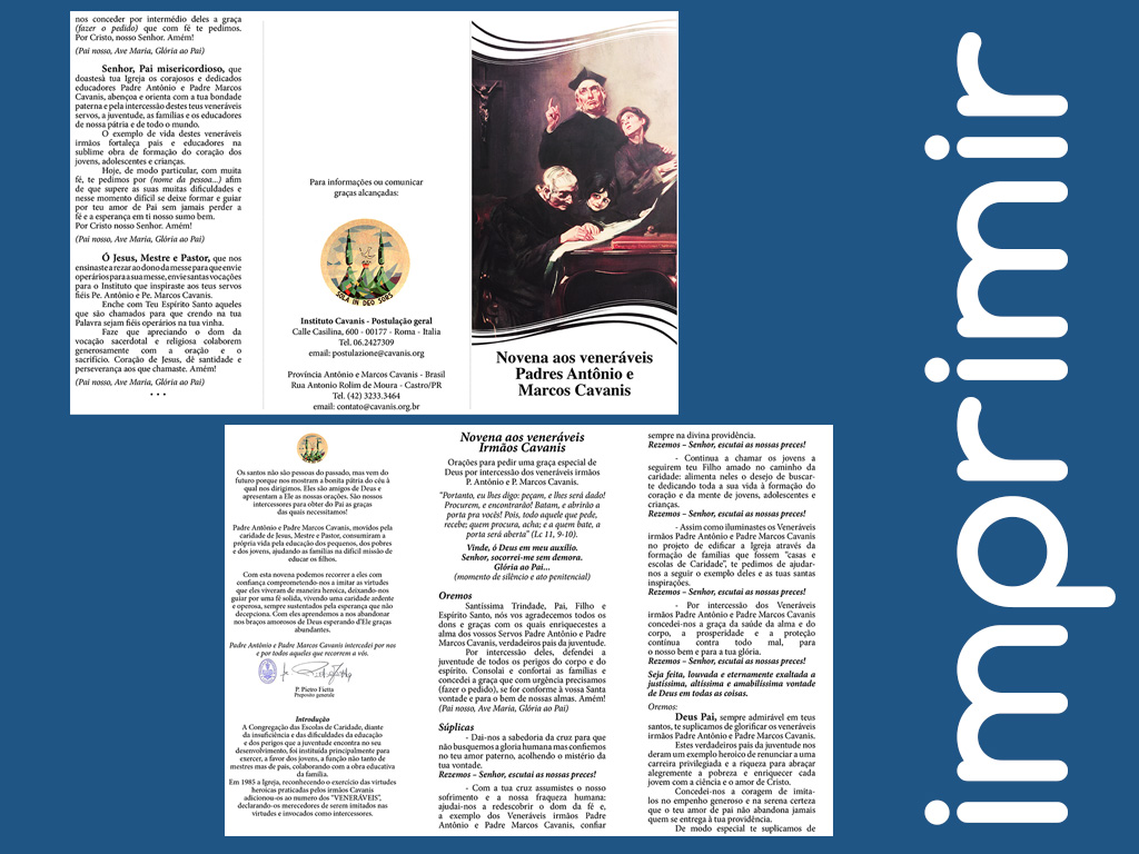 Novena aos veneráveis Padres Antônio e Marcos Cavanis Link do arquivo para impressão abaixo...Com esta novena podemos recorrer a eles com confiança comprometendo-nos a imitar as virtudes que eles viveram de maneira heroica, deixando-nos guiar por uma fé solida, vivendo uma caridade ardente e operosa, sempre sustentados pela esperança que não decepciona. Com eles aprendemos a nos abandonar nos braços amorosos de Deus esperando d’Ele graças abundantes. Padre Antônio e Padre Marcos Cavanis intercedei por nos e por todos aqueles que recorrem a vós.