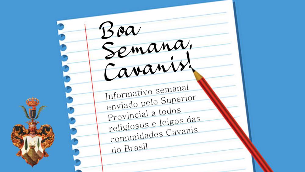 COMUNICADOS SE APROXIMA A NOSSA SEMANA CAVANIS. Todos os anos celebramos a Semana Cavanis em Nossa Província e na Congregação. Esta semana é um espaço propício para tornar nosso CARISMA, ESPIRITUALIDADE, HISTÓRIA e MISSÃO mais conhecidos. Por isso, cada comunidade se esforce para prepara-la bem. Este ano a Sema Cavanis inicia dia 24 de abril e vai até dia 01 de maio. Já temos alguns subsídios como Terço Cavanis, Via-Sacra Cavanis, adoração, orações e cantos. Motivemos o povo para celebrar bem esse tempo.