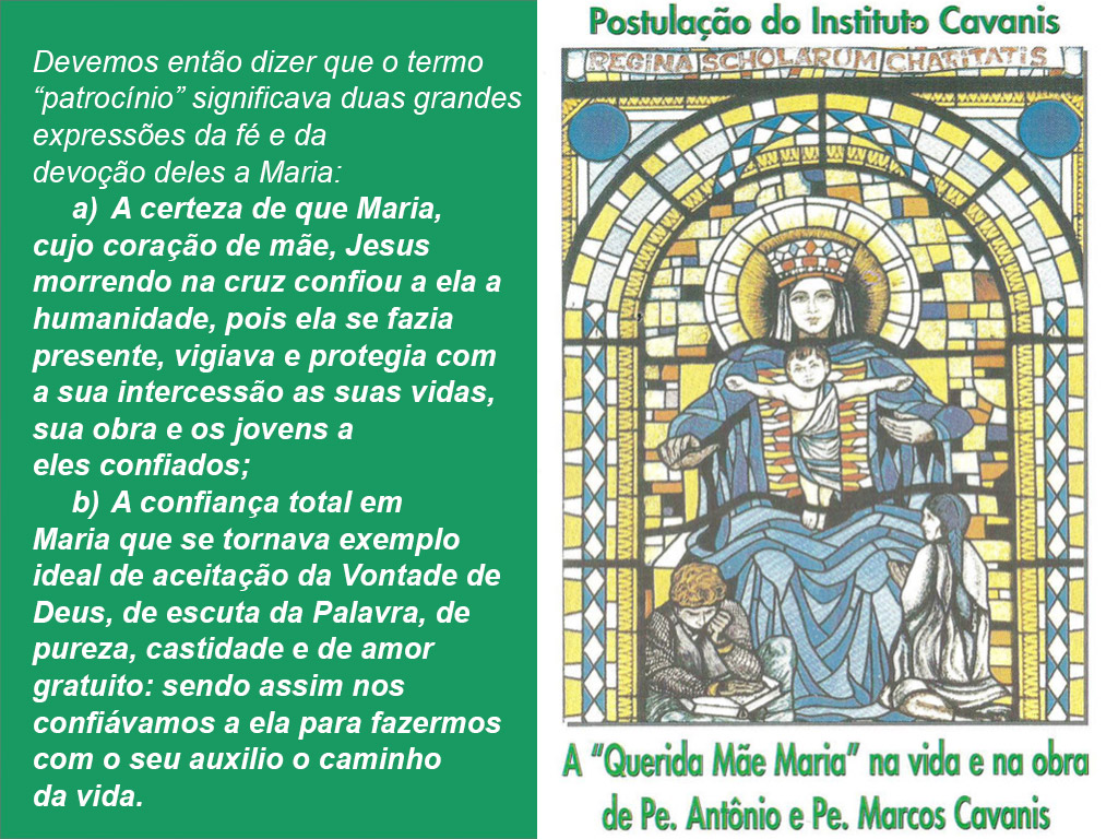 A "querida Mãe Maria" na vida e na Obra Cavanis 3CComo filhos dos veneráveis Antônio e Marcos Cavanis, somos todos confiados a “particular intercessão da “Bem-aventurada Vigem Maria”, desde o início da história da nossa Congregação das Escolas de Caridade. A vocação Cavanis, como caminho de santificação, consiste em imitar as virtudes e o estilo de vida de Maria, Mãe de Jesus. Temos necessidade de uma fonte onde podemos alcançar a água que sacia a nossa sede. Ela também será a fonte de alegria e esperança.