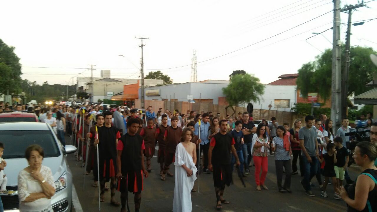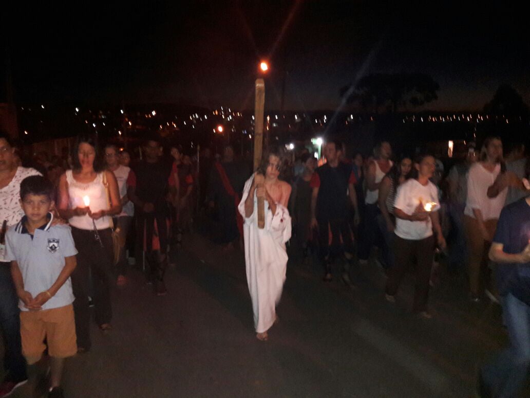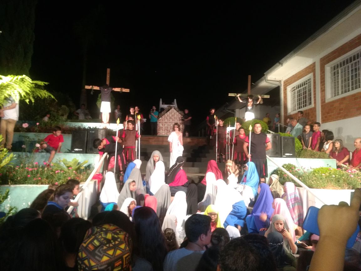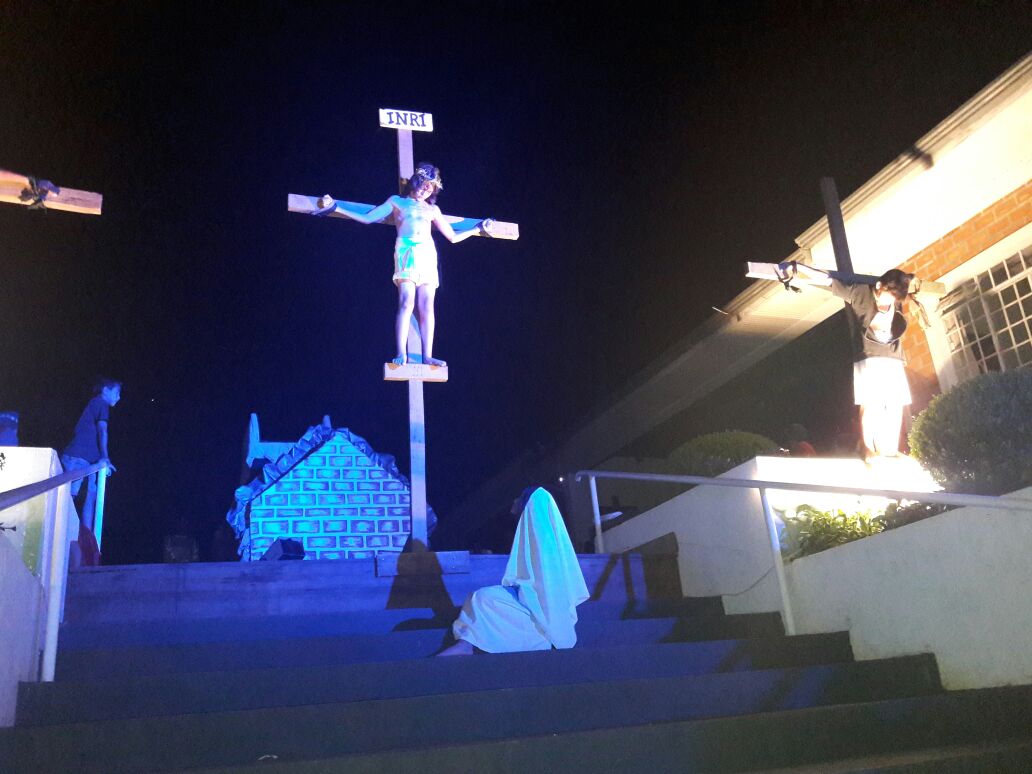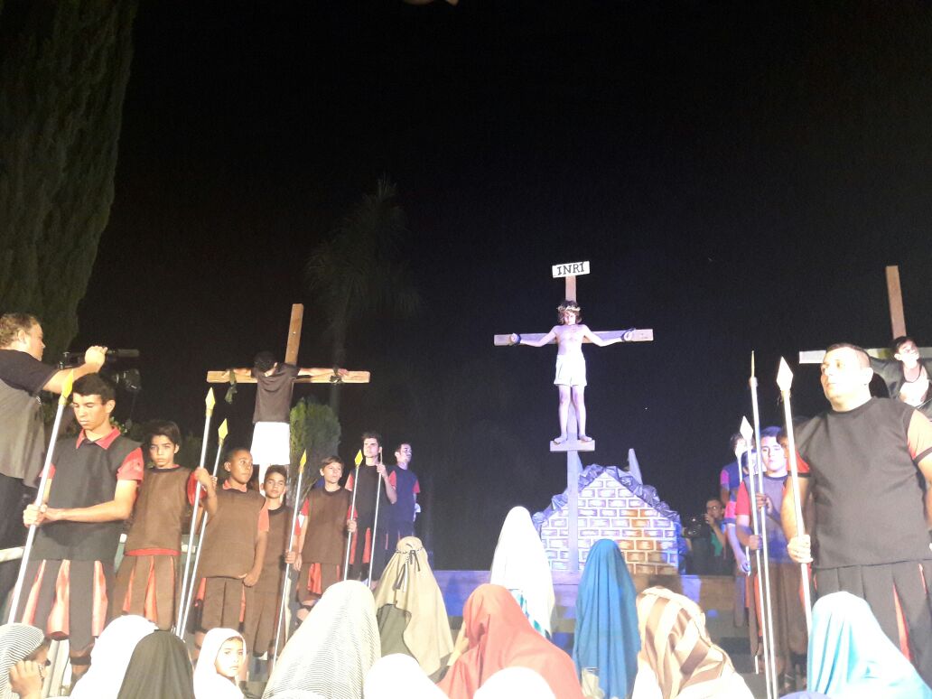 Via Sacra encenada No detalhe momento da crucificação de Jesus.As crianças e jovens da Casa da Criança Padre Livio Donati na Sexta feira Santa deste ano realizaram a encenação da Via Sacra. Foi um momento de fé e devoção em que muitos fiéis de nossa comunidade puderam vivenciar a Paixão de Cristo. A encenação contou com a participação de mais de 50 crianças e adolescentes. Paixão de Cristo encenada - Ortigueira-PR