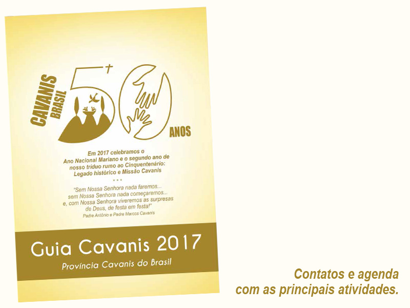 Guia Cavanis 2017 3C.Esta importante ferramenta auxília dando acesso rápido e fácil para informações relevantes como endereços de nossas comunidade e Obras, e ainda, trazendo datas de atividades e programações importantes a nível de Província.