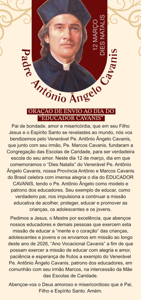 Pedimos a Jesus, o Mestre por excelência, que abençoe nossos educadores e demais pessoas que exercem esta missão de educar a “mente e o coração” das crianças, adolescentes e jovens e os enviamos em missão ao longo deste ano de 2026, “Ano Vocacional Cavanis” a fim de que possam exercer a missão de educar com alegria e amor, paciência e esperança de frutos a exemplo do Venerável Pe. Antônio Ângelo Cavanis, patrono dos educadores, em comunhão com seu irmão Marcos, na intercessão da Mãe das Escolas de Caridade.